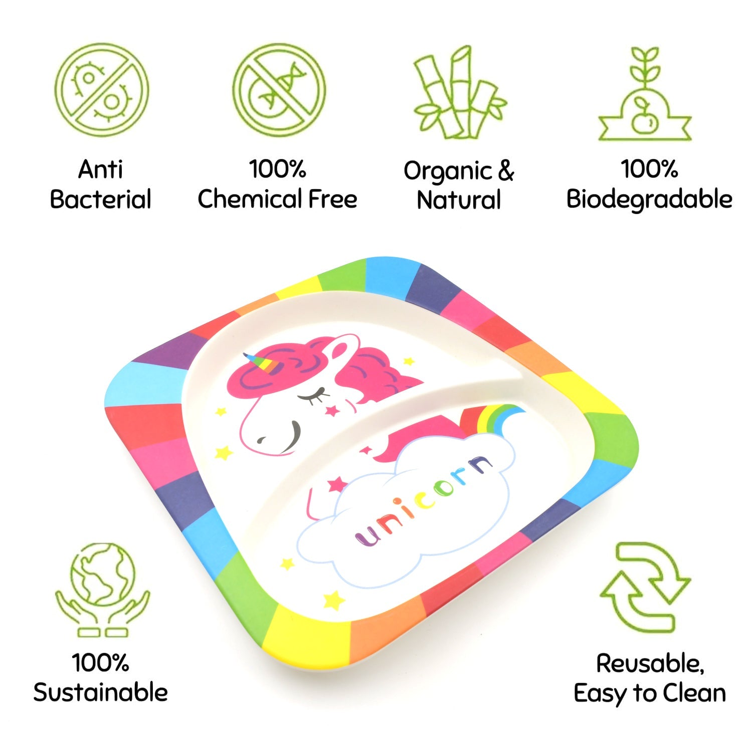 Bamboo Fiber Kids 1 Bowl, 1 Spoon, 1 Fork, 1 Glass, 1 Plate Unicorn Design for Kids and Toddlers, Children Dinnerware Set - Feeding Set for Kids, Cartoon Design Tableware Microwave & Dishwasher Safe (5 Pcs Set)